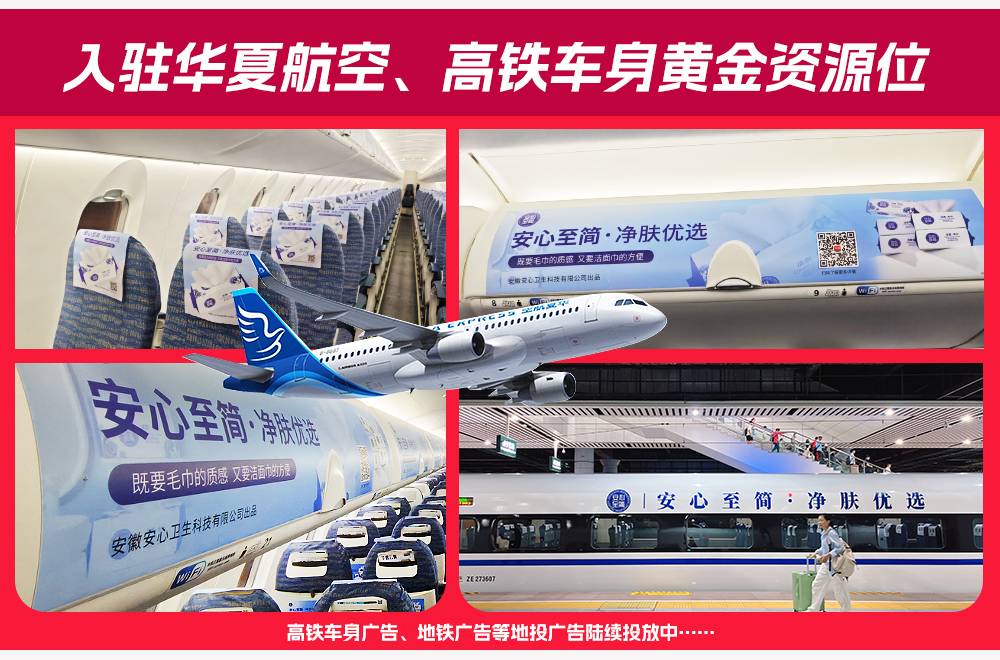 我公司“安心至簡(jiǎn)”品牌入駐華夏航空、高鐵車(chē)身黃金資源位,更多高鐵車(chē)身廣告、地鐵廣告等地投廣告陸續(xù)投放中……